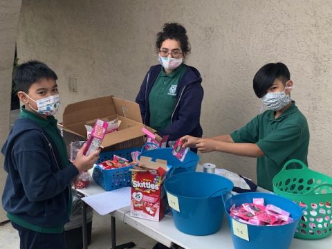 It was a barrage of ideas, and these passionate students ran with the idea. Before the end of the day, I had 3 different advertisement posters in hand and they were excited! And the 5th & 6th grade Valentine’s Day fundraiser was born. Students figured out our base cost and determined our mark-up prices. We posted flyers and sent emails to parents. The orders started to come in, slowly at first, and more on the Monday before Valentine’s Day. Three of my students, Rafe Carpio, Andre An and Paola Gonzalez stayed after school for 3 hours on Thursday to fill the orders and sort the candies by class. A friend from our local church volunteered to buy the roses wholesale and helped dethorn the roses for us.